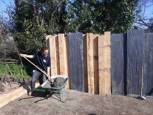 Création de clôtures en traverses paysagères et palis de schiste, d’une allée, réalisation des massifs, d’une mare, d’une plage de galets